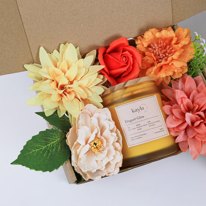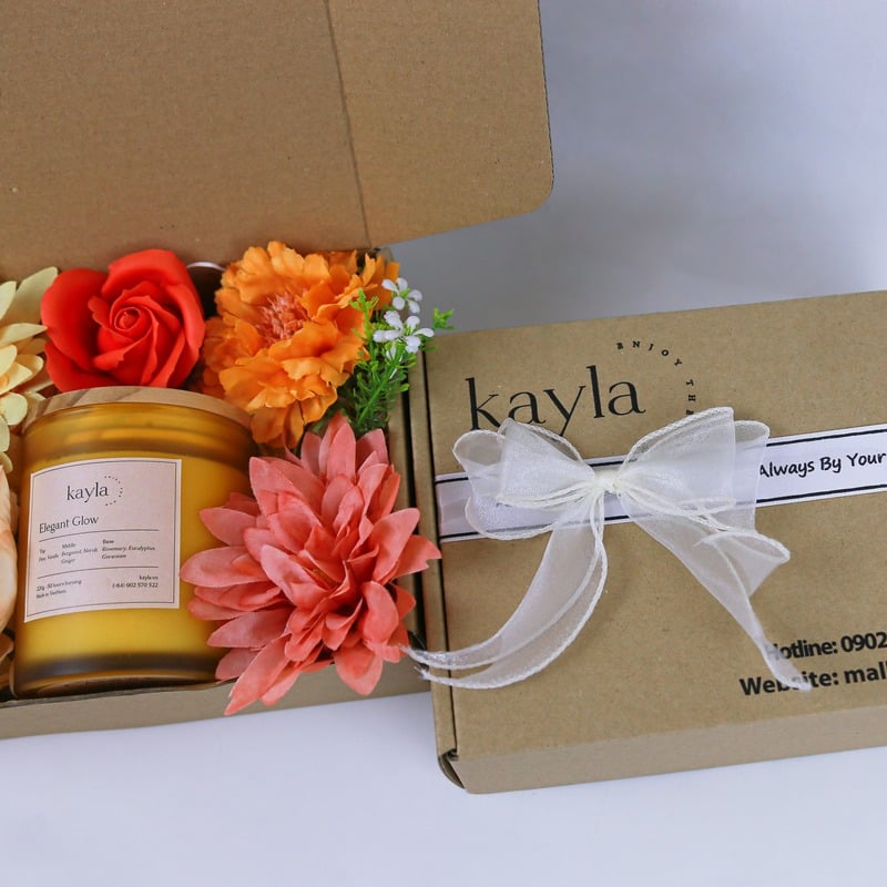 Một hộp quà rực rỡ như ánh nắng mai, kết hợp nến thơm Elegant Glow dịu nhẹ cùng hoa decor tinh tế và bông hoa sáp nhỏ xinh. Tất cả tạo nên sự ấm áp, an lành và tràn đầy năng lượng tích cực.